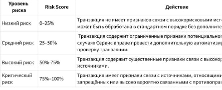 По результатам автоматизированного анализа каждой транзакции присваивается Risk Score (оценка риска) — количественный показатель в диапазоне от 0 до 100 или Уровень риска, отражающий вероятность того, что транзакция может быть связана с высокорисковой или запрещённой деятельностью.